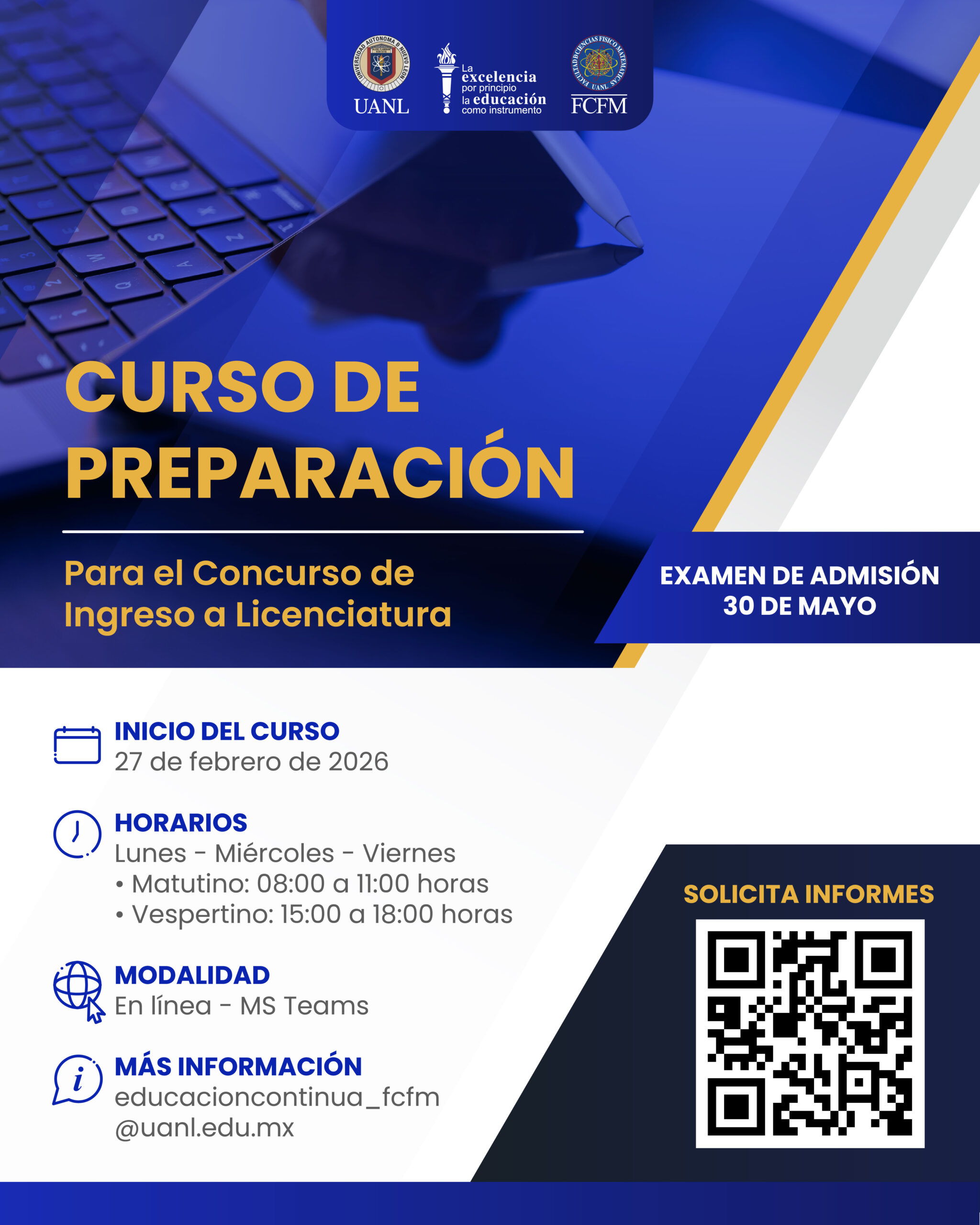 La Facultad de Ciencias Físico Matemáticas de la UANL invita a las y los aspirantes a participar en el Curso de Preparación para el Concurso de Ingreso a Licenciatura, diseñado para fortalecer los conocimientos y habilidades necesarios para presentar el examen de admisión, programado para el 30 de mayo.